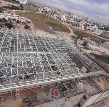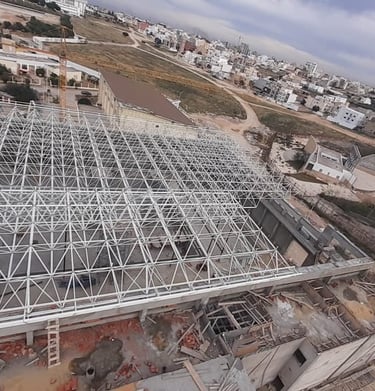 A construction site featuring extensive scaffolding with a bright green and orange barrier labeled 'Poort 4'. Two construction workers, one in overalls and the other wearing a helmet, sit on concrete blocks behind a fence. A blue truck is partially visible in the background.