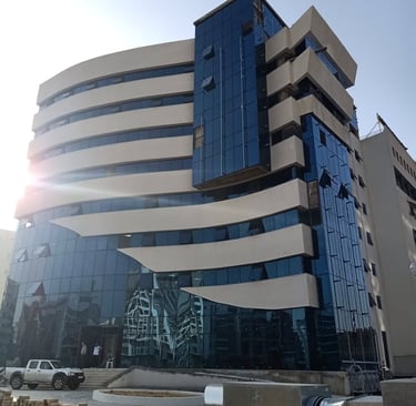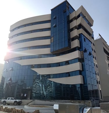 A construction site features an extended concrete pump with a bright green arm reaching high into the clear blue sky. Workers in construction gear, including hard hats and reflective vests, are positioned on a structure below, attending to various tasks. The setting suggests an active work environment on a building site.