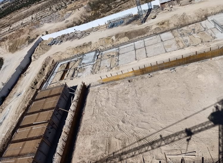 Two construction workers are involved in infrastructure development beside a body of water. One worker is positioned on the edge of the embankment, wearing a helmet and an orange safety vest, preparing machinery. The other worker is on a floating platform, guiding or holding a large metal sheet beside tall reeds. Graffiti decorates the brick wall in the background, adding an urban element to the environment.